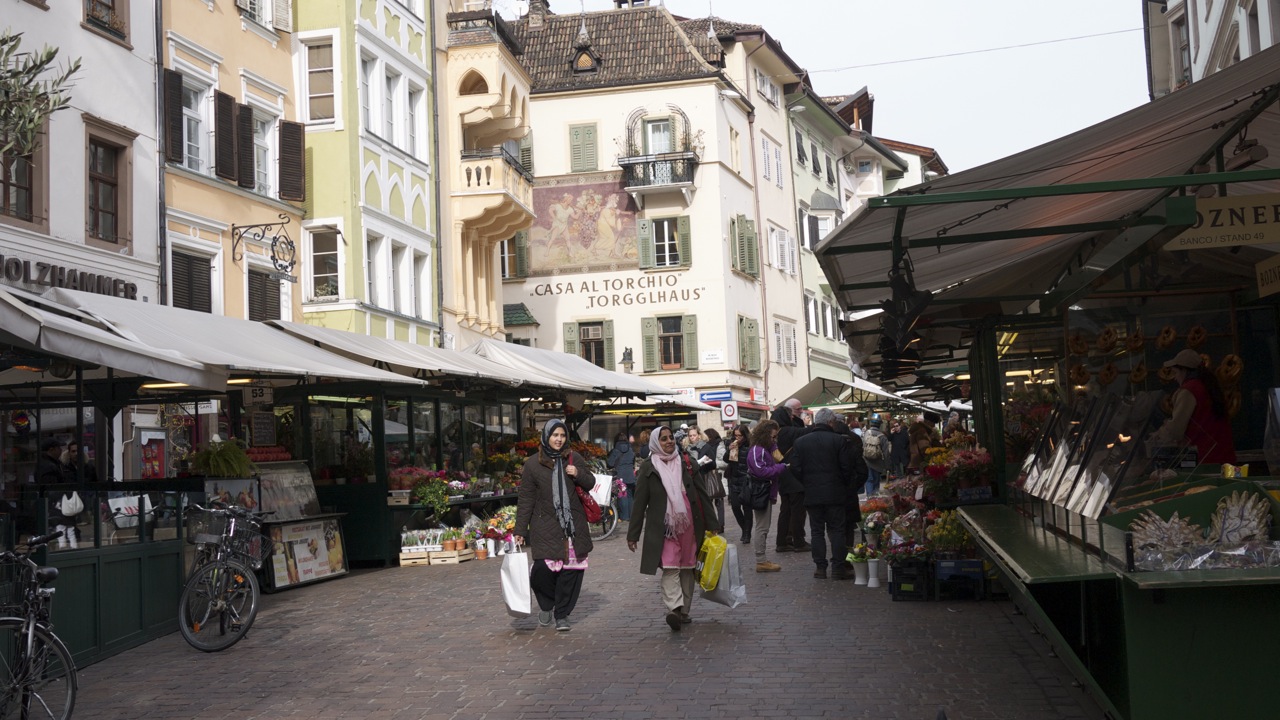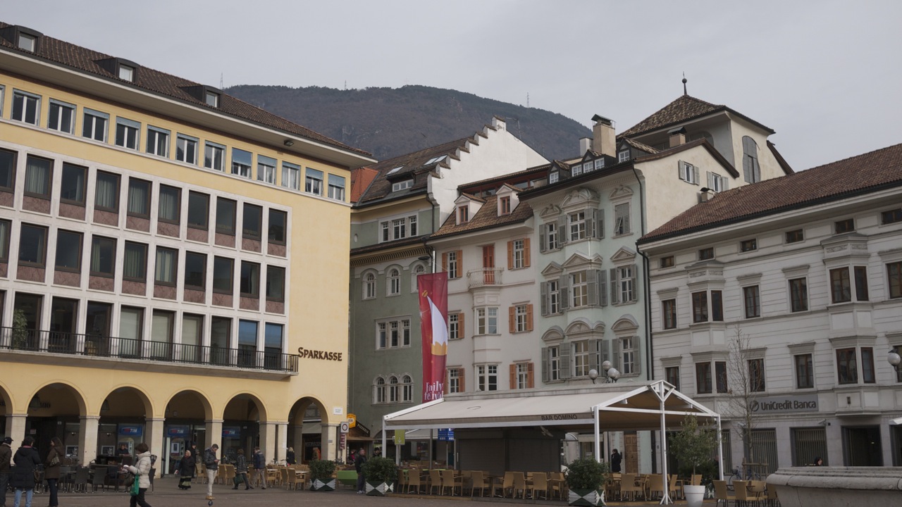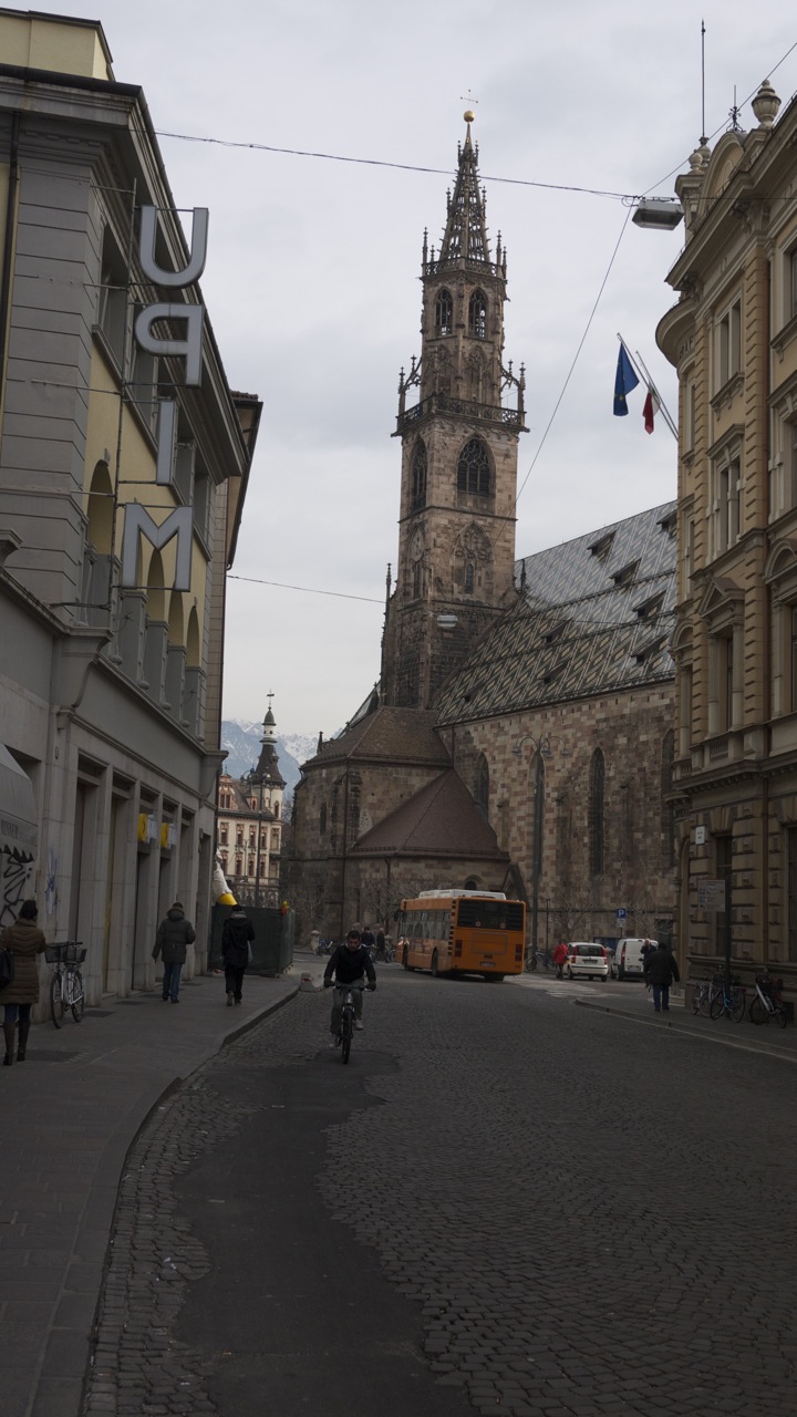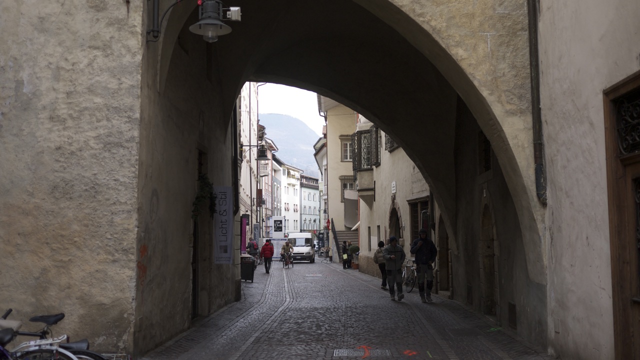 (FOTO’S) Bolzano (Bozen in het Duits) is de hoofdstad van Zuid-Tirol. Bij het uit de bus stappen werd ik bijna overreden, nota bene door een fiets. Verrassend, fietsers in deze mooie oude Italiaanse bergstad en niet één fietser maar honderden; jongeren, bejaarden, moeders met kinderen, het lijkt wel Amsterdam. De rijwielers crossen over marmeren voetpaden, racen door autoluwe steegjes en stuiteren van middeleeuwse trappen, geweldig. Het voelt helemaal als thuiskomen. Het stadje heeft een sfeervol oud centrum met ongelooflijk veel winkeltjes. Jammer dat de Italianen van die achterlijk lange middagpauzes houden anders had ik er heerlijk kunnen shoppen.