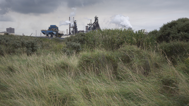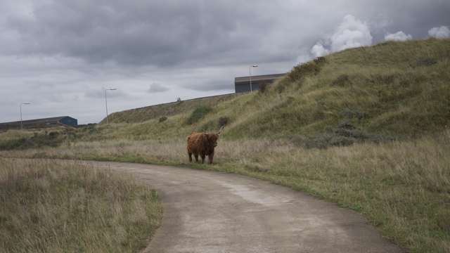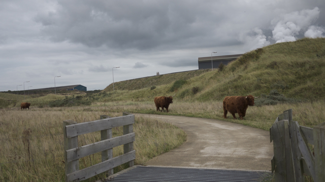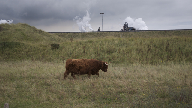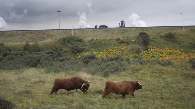 (FOTO’S) Een waanzinnige plek, zeeschepen komen vlak langs de strandtenten. In de duinen schijten Galloways koeien naast grote roestige kunstwerken. En vanuit het uitkijkpunt kun je genieten van het indrukwekkende industriĆ«le landschap.